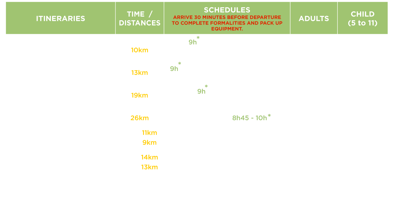 1 waterproof container included per boat – Additional container rental +2 €Solo or single-seater kayak + €3 euros on each price. Price per person.